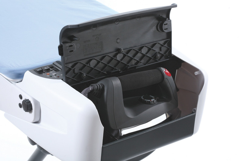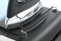 Während der Bügelarbeiten kann das Bügeleisen auf der hitzebeständigen Abstellfläche abgestellt werden. Der angebrachte Sicherheitsbügel verhindert das versehentliche Herunterfallen des Bügeleisens von der Abstellfläche.