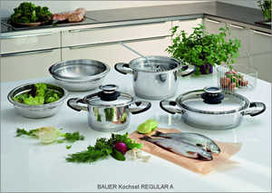 Die einzelnen Komponenten der BAUER-Kochsets sind optimal aufeinander abgestimmt und machen erst in ihrer Kombination das effektive Kochen nach der speziellen BAUER-Garmethode ohne Zusatz von Wasser und Fett möglich. Deshalb wird das BAUER-Kochgeschirr ausschließlich im Set vertrieben.